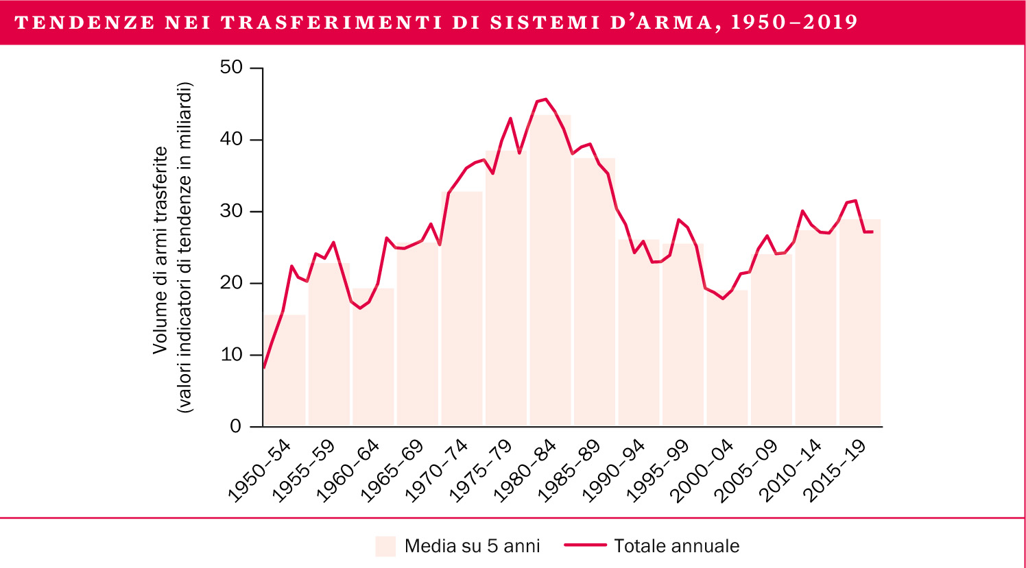 Leggiamo nel grafico il volume dei trasferimenti di materiale bellico (importazioni ed esportazioni in miliardi di valori indicatori di tendenza). [Dati SIPRI- Stockholm International Peace Research Institute Yearbook 2020- Armaments, Disarmament and International Security- sintesi in Italiano]