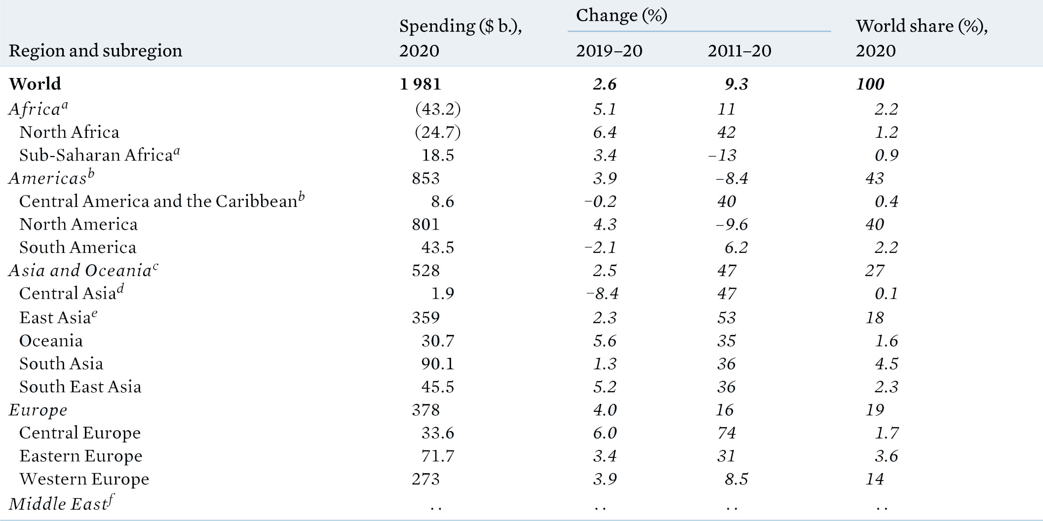 . . = dato non disponibile o non applicabile; ( ) = stima incerta. a) Le cifre escludono Gibuti, Eritrea e Somalia. b) I dati escludono Cuba. c) Le cifre escludono la Corea del Nord, il Turkmenistan e l'Uzbekistan. d) I dati escludono il Turkmenistan e l'Uzbekistan. e) Le cifre escludono la Corea del Nord. f) Nessuna stima SIPRI per il Medio Oriente è disponibile per il 2015-20. Una stima approssimativa per il Medio Oriente (esclusa la Siria) è inclusa nel totale mondiale.