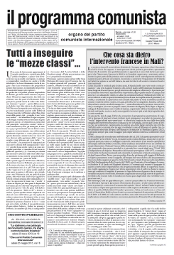 Editoriale: Tutti insieme ad inseguire le “ mezze classi”- Mondo del lavoro: Da un capo all’altro del Continente africano, i proletari in lotta-Occupare la fabbrica o porsi il problema del potere?-Chi sono i mandanti dei suicidi operai?-Ilva di Taranto: ancora e sempre Sua Maestà l’Acciaio- Scritti: Dal Contratto Nazionale e di Categoria al Contratto Aziendale e “Ad personam”. Per una storia della contrattazione (III)- Brasile, Russia, India, Cina: lo sBRICiolamento- Una ricchezza italica: le Elezioni- Ombre cinesi-Lavorando al V volume della Storia della Sinistra Comunista- Articoli sulla crisi economica su “ Il programma comunista”- Usa: La riforma dell’immigrazione, nuovo amo per i gonzi.- Testi: “ Raddrizzare le gambe ai cani” ( Da Battaglia Comunista, 1952)