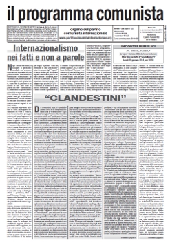 Editoriale: Internazionalismo nei fatti e non a parole- Mondo del lavoro: La reginetta dei frigoriferi (Elettrolux) - Un passo avanti e due indietro (breve cronaca da Pomigliano)- Lavoratori in lotta (Bangladesh, Usa, Repubblica ceca, Messico)- Dannati del mare, dannati del Capitale (sulla strage dei migranti nel mare di Lampedusa)- Riflessioni dal bordo di un buco nero (Sindacalismo di base)-Articoli: ”Clandestini”- Perché non siamo “bordighisti”- “Borghesi di tutto il mondo, diamoci una calmata!” (a proposito dei ritorni di “anticapitalismo” piccolo-borghese)- Corso del capitalismo mondiale (K.Marx, dal Capitale “Eccesso di capitale con eccesso di popolazione”)- Lavorando al V volume della Storia della Sinistra comunista- “Il partito è un’unità storica reale, non una colonia di microbi uomo” (Manuale dei principi, da Dialogato coi morti)- Il partito, la classe, la rivoluzione (L. Trotsky- Gli insegnamenti della comune di Parigi,1921)- Agli americani piacciono le bolle- India, il sogno infranto dalla Vecchia Talpa-Fumisterie dell’Accademia-Pronto, chi ascolta?