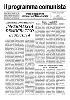 • Editoriale: La guerra si addice allo stato imperialista democratico e fascista • Articoli: Primo Maggio 2024 Contro tutte le guerre imperialiste! • Ennesima strage di lavoratori. Chi è l’assassino? • Una nuova genia di “affossatori del marxismo” (II) • Monfalcone, fronte del mondo • Le proteste “pro Palestina” nelle università • La memoria corta dell’antifascismo • Vita di Partito